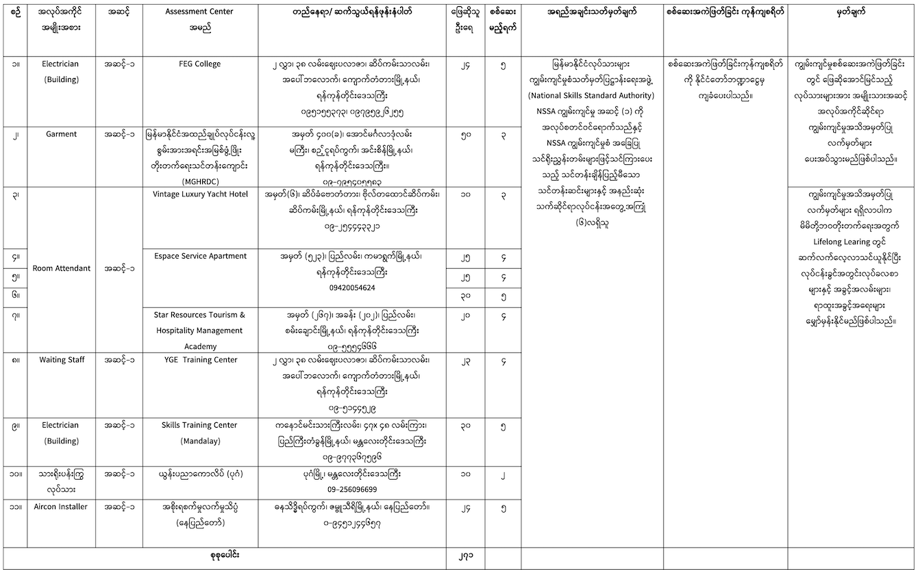 ၂၀၂၅ ခုနှစ်၊ ဒီဇင်ဘာလအတွင်းကျွမ်းကျင်မှုစစ်ဆေးအကဲဖြတ်ရေးဌာနများ၌ ကျွမ်းကျင်မှုစစ်ဆေးအကဲဖြတ်မည့် အလုပ်အကိုင်များ